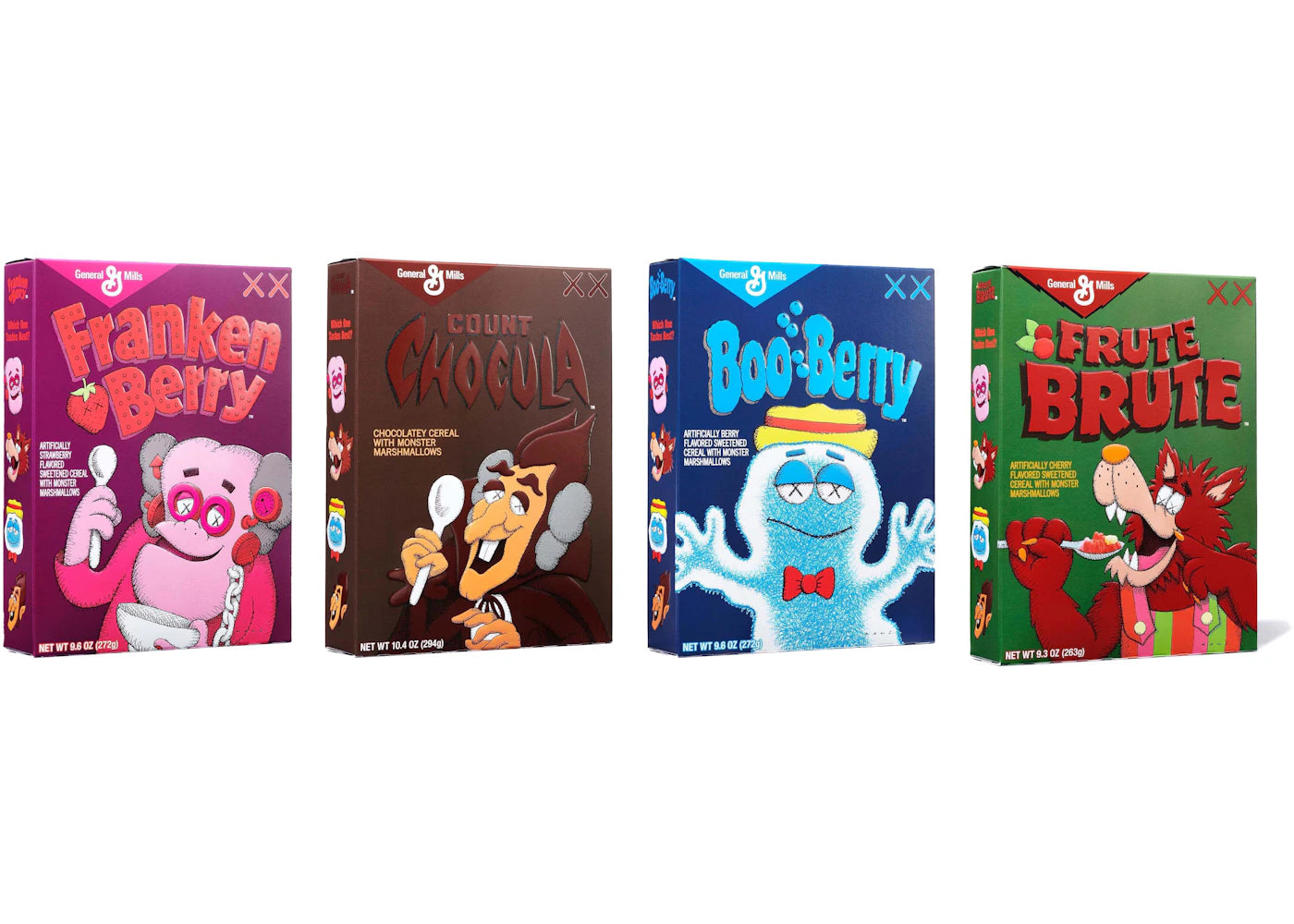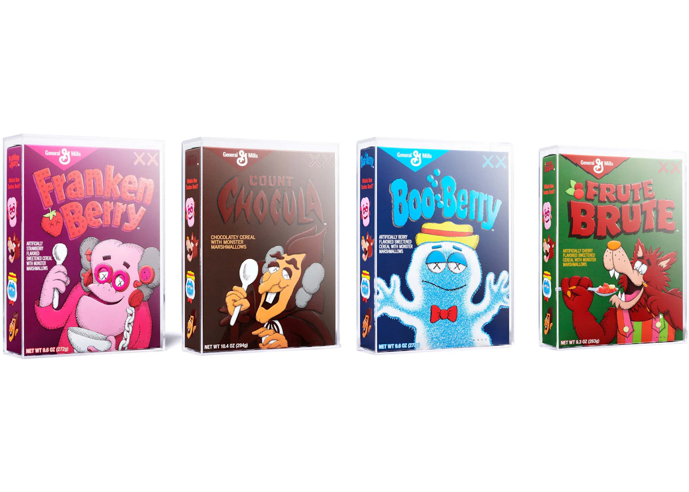 The KAWS Monsters Franken Berry Count Chocula Boo Berry Frute Brute Cereal Limited Edition in Acrylic Case 4x Lot (Not Fit For Human Consumption) is now available at Side Kicks!...