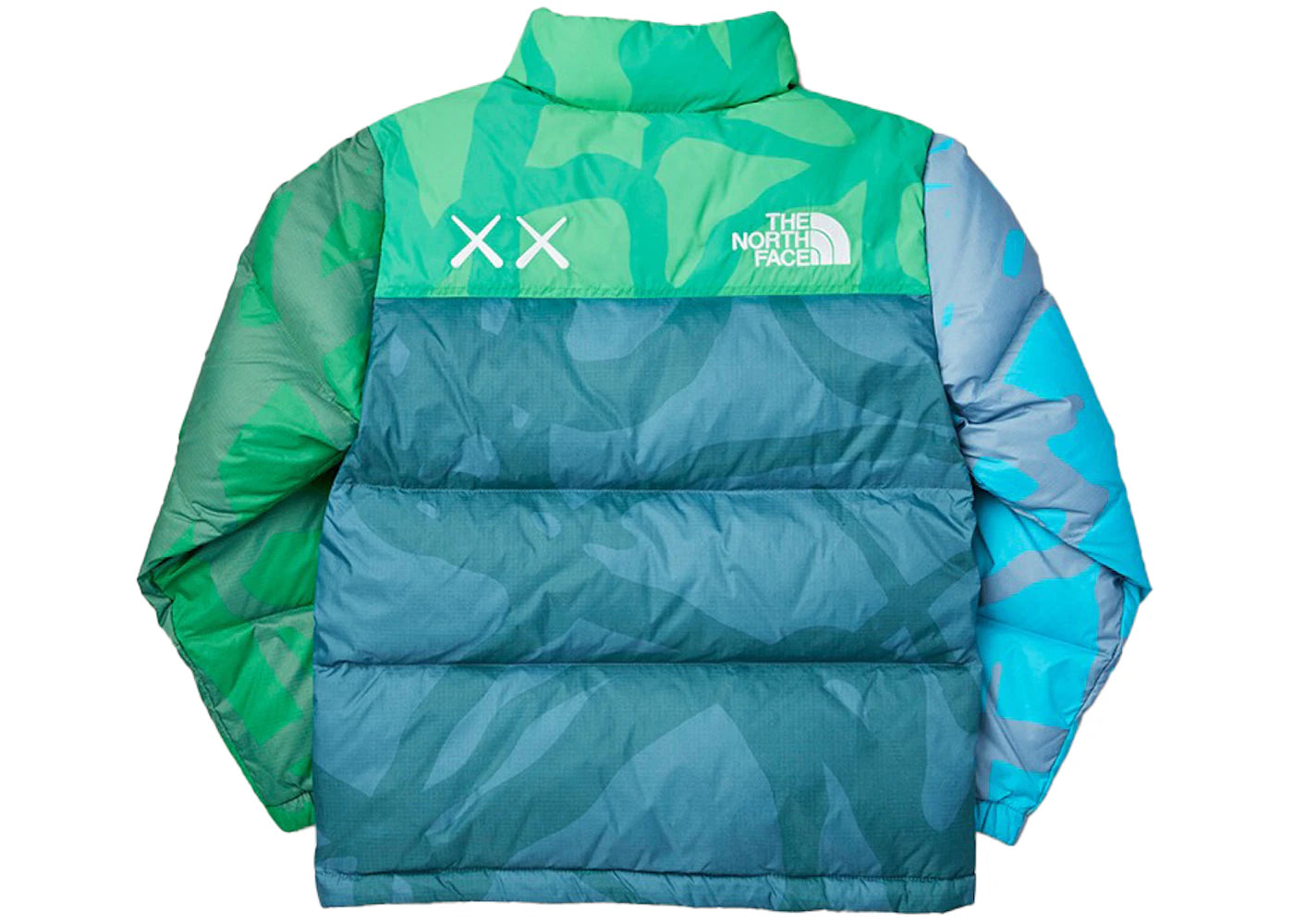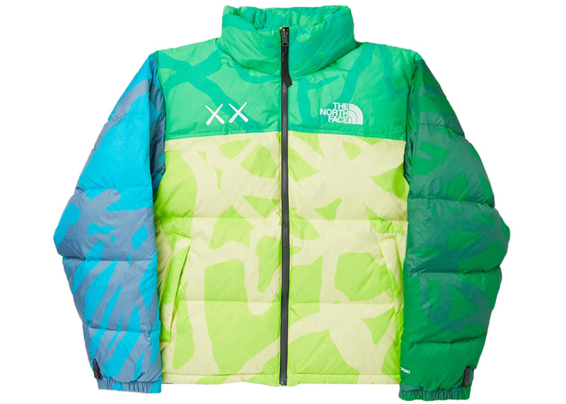 The KAWS x The North Face Youth Retro 1996 Nuptse Jacket KW Safety Green Nuptse Print is now available at Side Kicks!