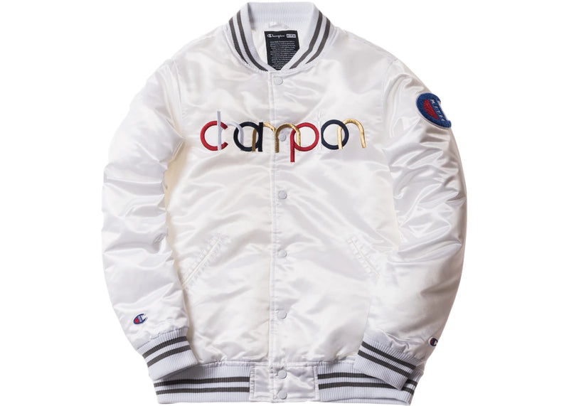 The Kith Champion Baseball Jacket White is now available at Side Kicks!