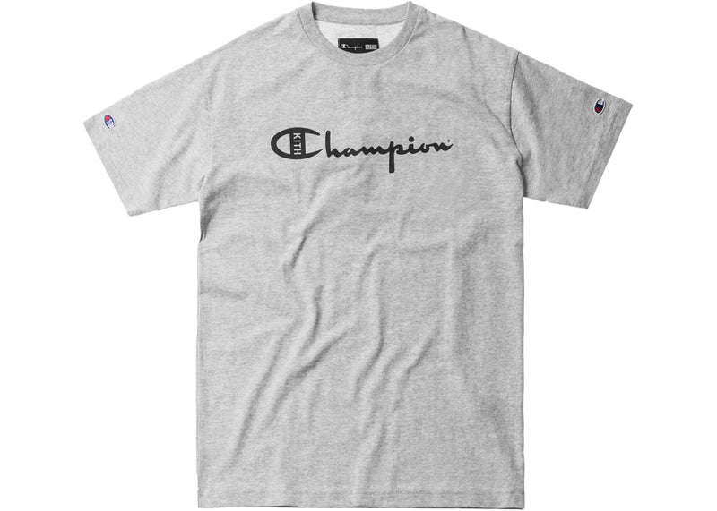 The Kith Champion Script Logo Tee Heather Grey is now available at Side Kicks!