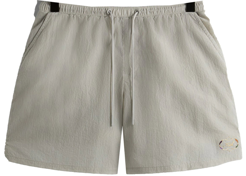 The Collins Swim Short features a nylon swim fabric construction with an elasticated, drawcord-adjustable waistband and rubberized trims. It includes a full mesh lining, secure zippered back pockets, and side hem slits. The design incorporates Kith logo artwork above the thigh and sits above the knee for a tailored fit. Released on {date}, the Collins Swim Short is available now at Side Kicks.