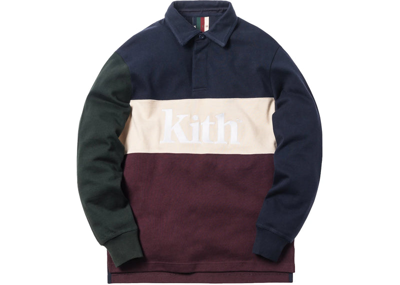 The Kith Color Blocked Rugby Navy/Burgundy/Green is now available at Side Kicks!