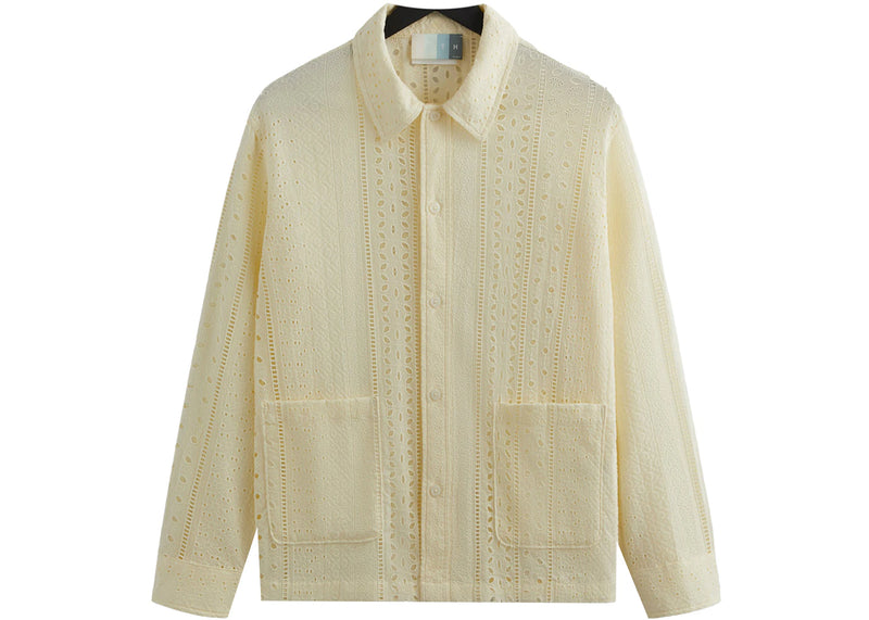 The Cotton Eyelet Boxy Collared Overshirt features a lightweight cotton eyelet fabric with all-over embroidery. It includes Kith-branded button closures on the front and cuffs, with a straight fit and slightly dropped shoulders for a relaxed look. Released on {date}, the Cotton Eyelet Boxy Collared Overshirt is available now at Side Kicks.
