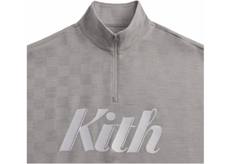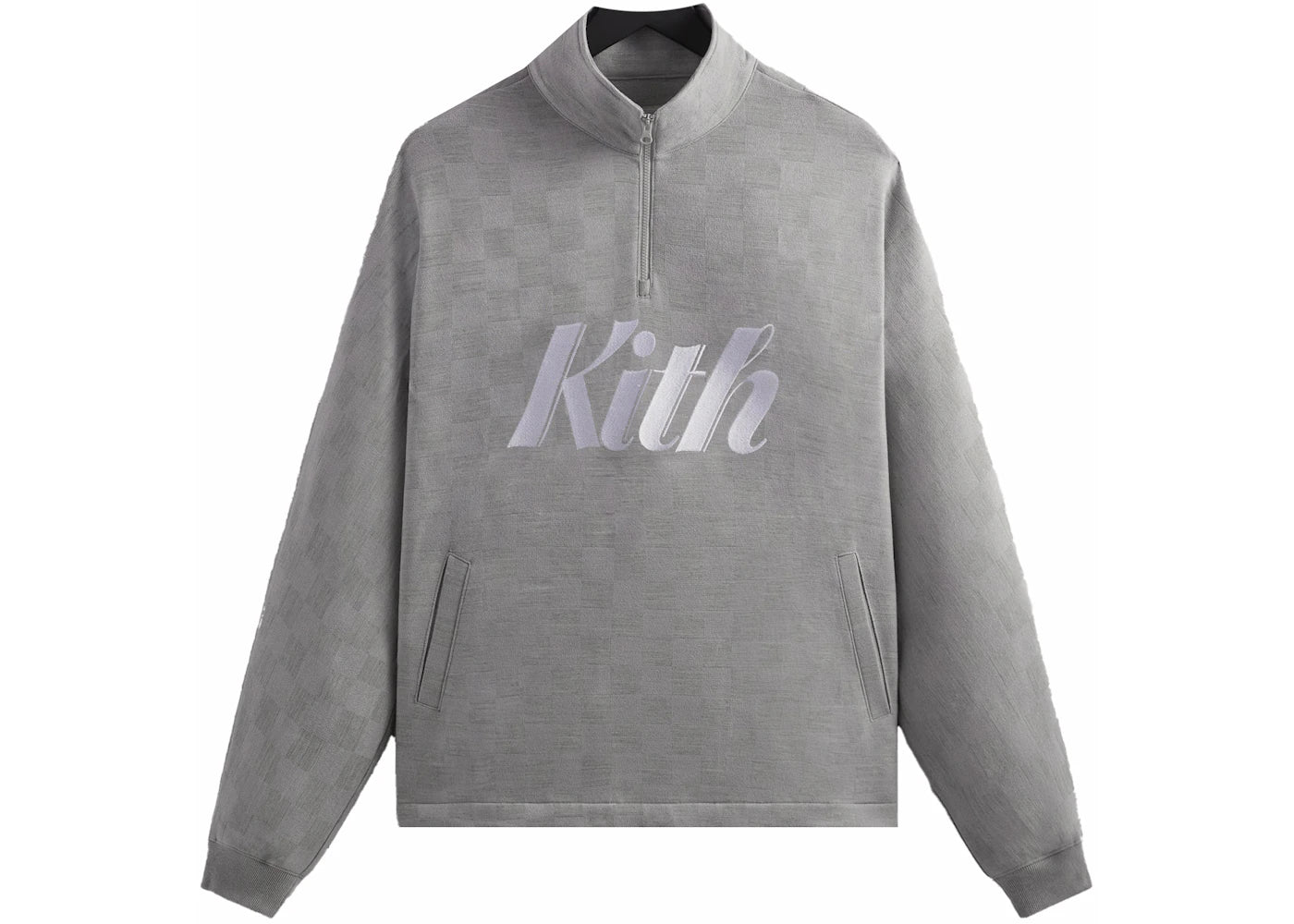 The Double Knit Davis Quarter Zip Pullover features a custom checkerboard double-woven fabric. It includes Dolan sleeve construction, a bungee-adjustable hem, ribbed sleeve cuffs, and embroidered Kith artwork at the front. Released on {date}, the Double Knit Davis Quarter Zip Pullover is available now at Side Kicks.