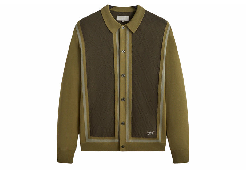 The Girard Cardigan features a knit blend construction with an all-over diamond-stitched pattern. It includes Kith-branded button closures, ribbed sleeve cuffs, and a polo collar. Kith Script embroidery accents the hem for a refined finish. Released on {date}, the Girard Cardigan is available now at Side Kicks.