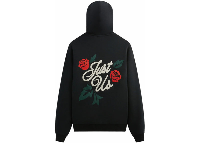 The Kith x Poetic Justice Hoodie Black features a cotton-blend fleece construction with a dual-layered hood and drawstring closure. It includes elasticized cuffs and waist for a snug fit, extending to mid-hip length. The design showcases a graphic of Tupac Shakur from the 1993 film "Poetic Justice," overlaid with "Kith" and "Just Us" text alongside a red heart. Released on January 7, 2019, the Kith x Poetic Justice Hoodie Black is available now at Side Kicks.