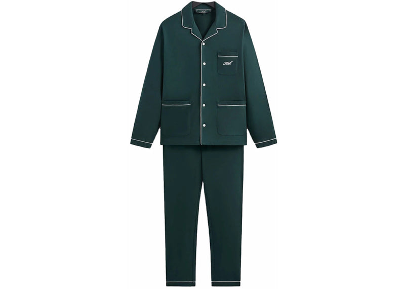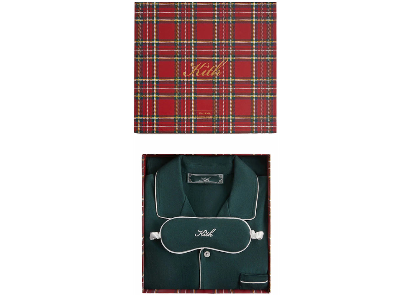 The Kithmas Script Pajama Set is made from heavy cotton jersey fabric with Kith-branded button closures and white piping accents. It includes a pajama shirt, pants, and a matching sleep...