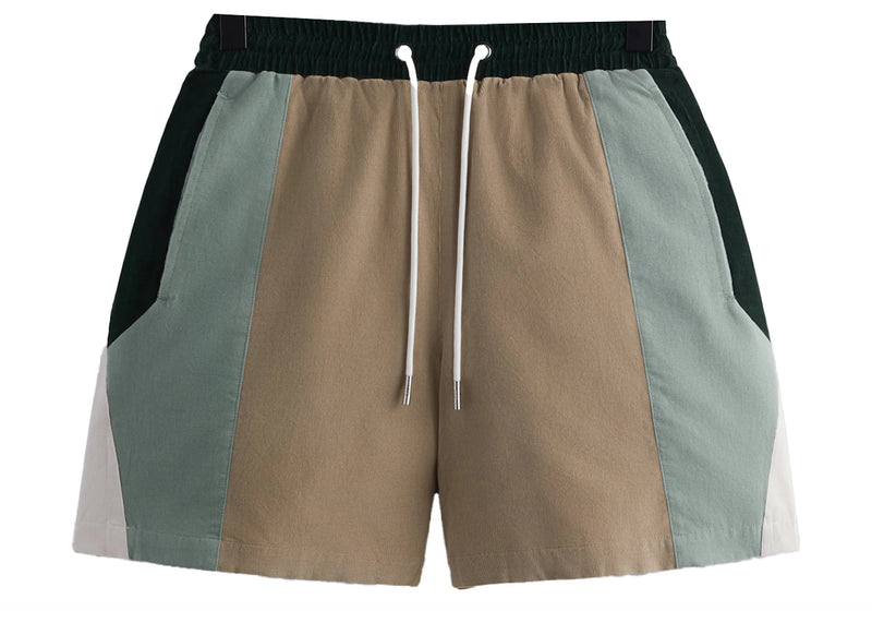 The Baby Cord Curtis Panelled Short is made from lightweight baby cord cotton with color-blocked paneling and a mesh lining. It features an elasticated, drawcord-adjustable waistband, Kith-branded hardware, and a zippered back pocket. The design includes embroidered Kith artwork below the waistband and sits slightly wide with an above-the-knee fit. Released on {date}, the Baby Cord Curtis Panelled Short is available now at Side Kicks.