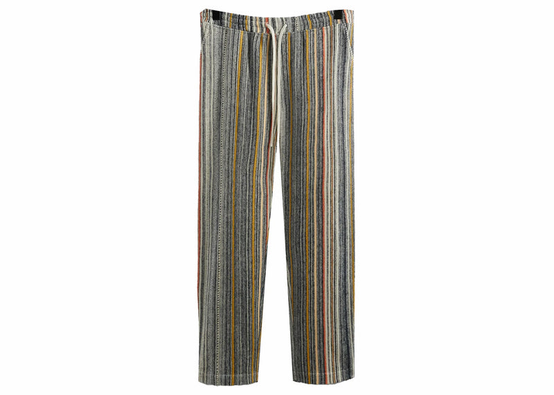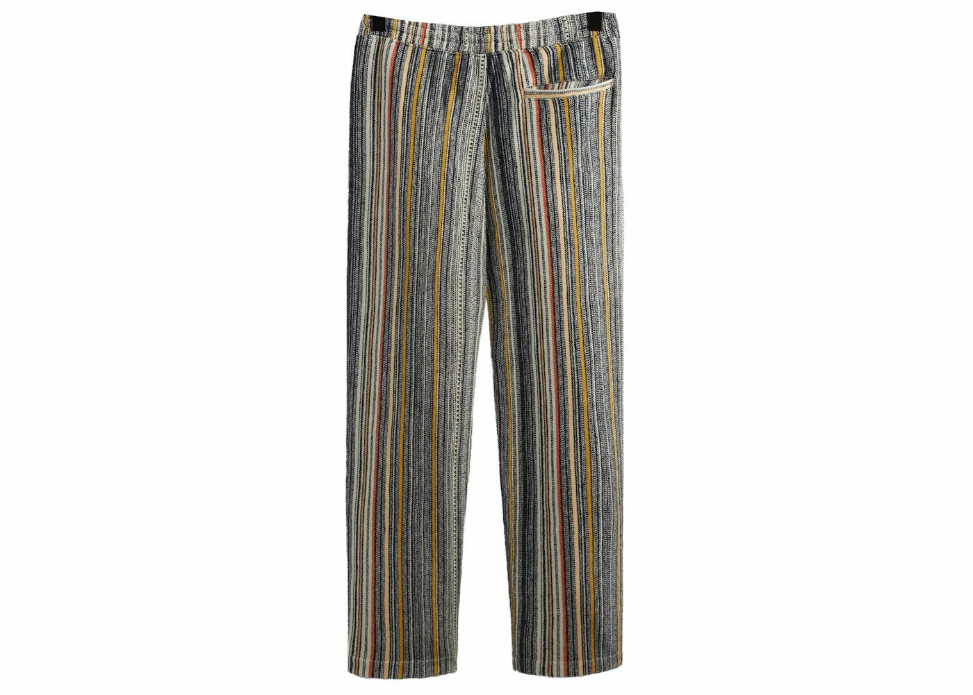 The Multi Stripe Barrow II Pant features a multi-yarn striped cotton construction with blanket stitch detailing. It includes side and back pockets, along with an elasticated, drawcord-adjustable waistband for a secure fit. Released on {date}, the Multi Stripe Barrow II Pant is available now at Side Kicks.