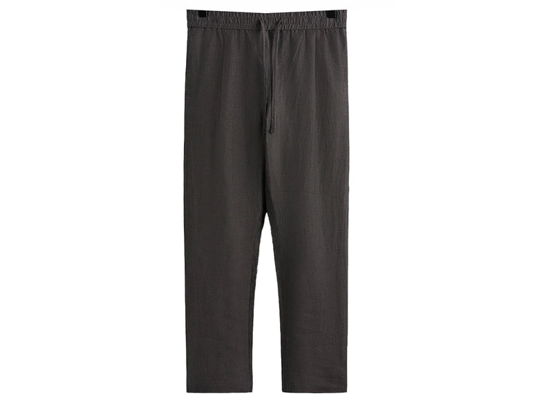 The Pinstripe Linen Almont Pant features a linen pinstripe fabric with an elasticated, drawcord-adjustable waistband. It includes front pleating, double welt back pockets, and a Kith & Kin satin label. Designed with a true-to-size fit, slightly tapered leg, and cropped length. Released on {date}, the Pinstripe Linen Almont Pant is available now at Side Kicks.