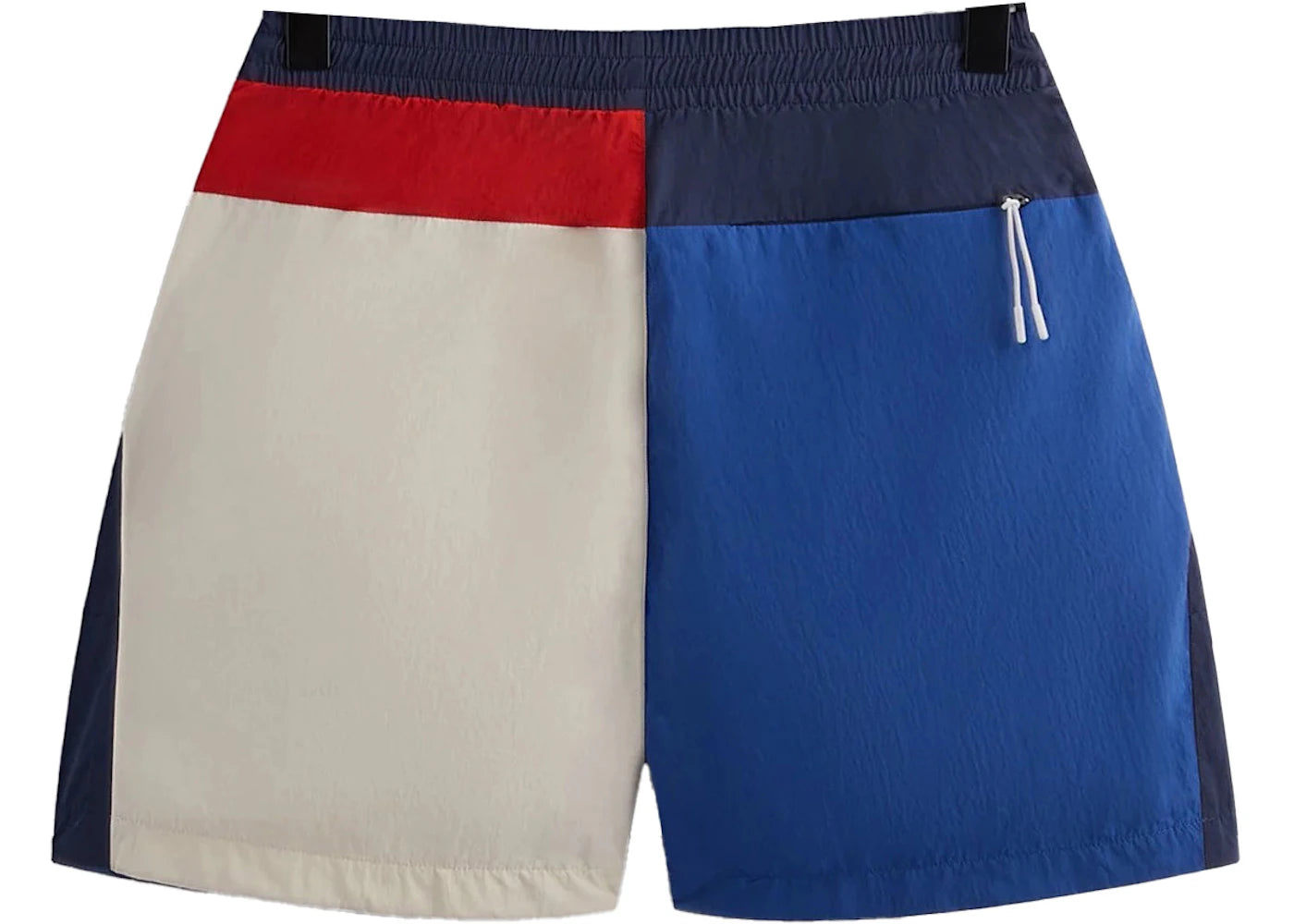 The Kith for Wilson Court Panelled Short features water-resistant, color-blocked nylon fabric with a mesh lining. It includes secure zippered front and back pockets and an elasticated, drawcord-adjustable waistband. Co-branded embroidery at the hem completes the design. Released on {date}, the Kith for Wilson Court Panelled Short is available now at Side Kicks.