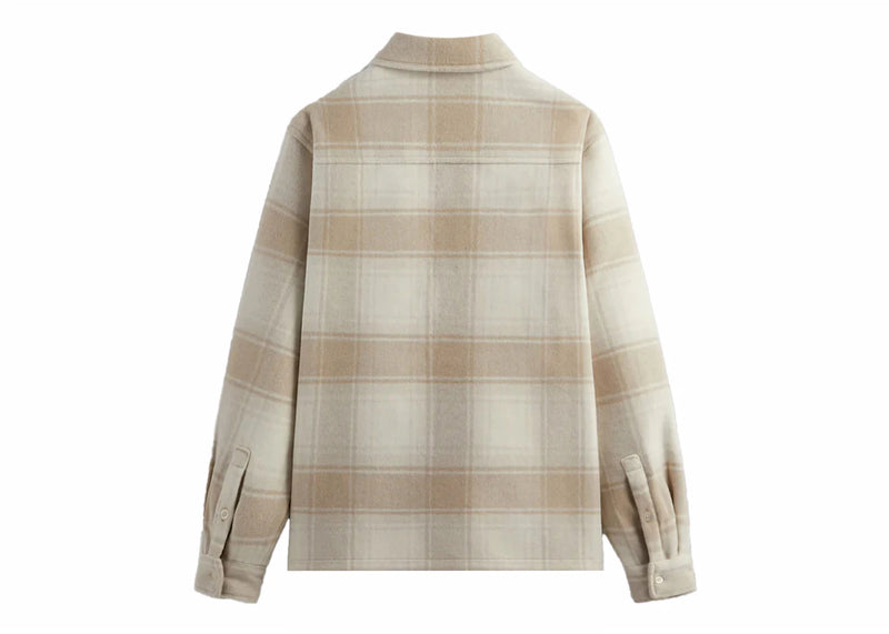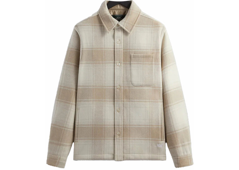 The Wool Ginza Shirt features a wool blend construction with a satin lining. It includes Kith-branded buttons on the front placket and cuffs, a side vent opening, and a chest patch pocket. Kith script embroidery accents the hem. Released on {date}, the Wool Ginza Shirt is available now at Side Kicks.