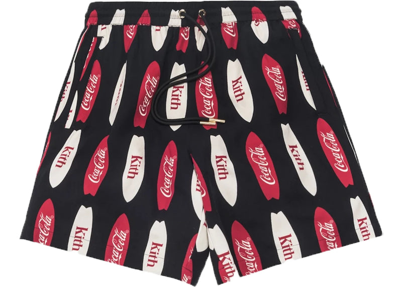 The Kith x Coca-Cola Surf Board Print Hardaway Shorts Black is now available at Side Kicks!