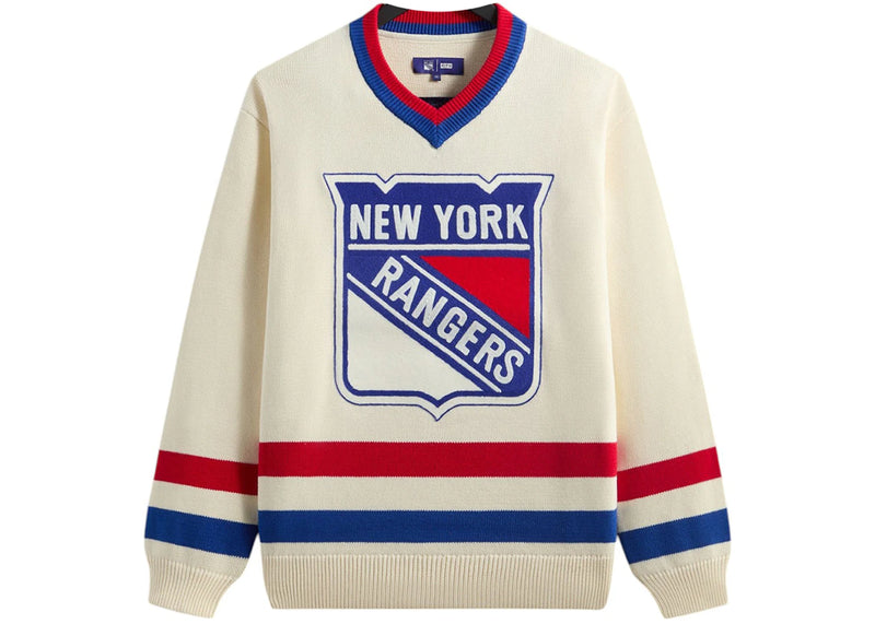 The Kith x New York Rangers V-Neck Lewis Sweater Sandrift is now available at Side Kicks!