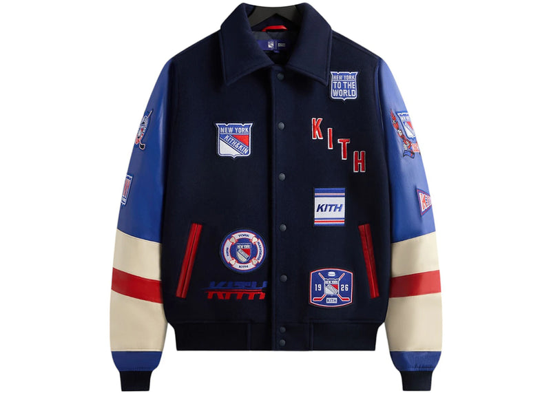 The Kith x New York Rangers Wool Leather Varsity Jacket Nocturnal is now available at Side Kicks!