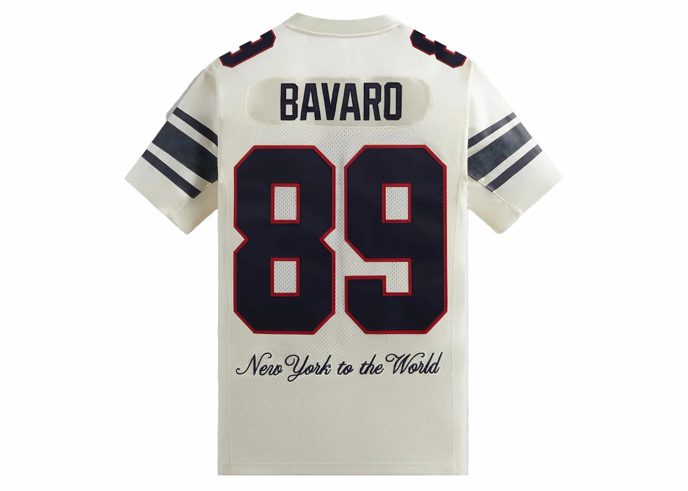 The Kith for the NFL: Giants Mitchell & Ness Mark Bavaro Jersey features tackle twill embroidery, zig-zag stitching, and custom sleeve striping. It includes Bavaro lettering, #89 varsity numbering, and "New York to the World" embroidery on the back. Released on {date}, the Kith for the NFL: Giants Mitchell & Ness Mark Bavaro Jersey is available now at Side Kicks.