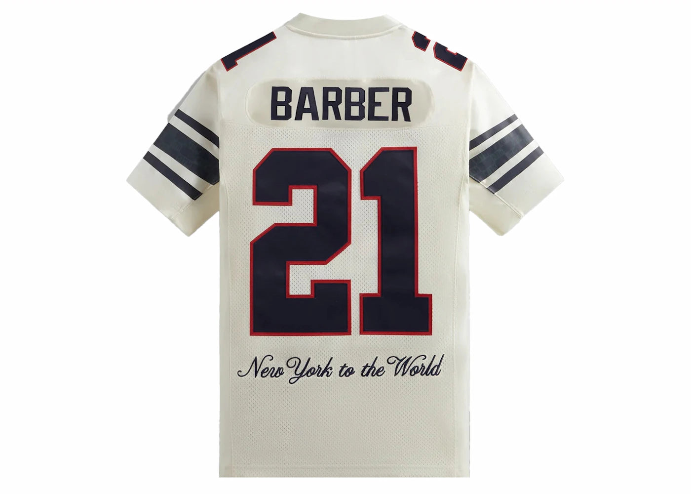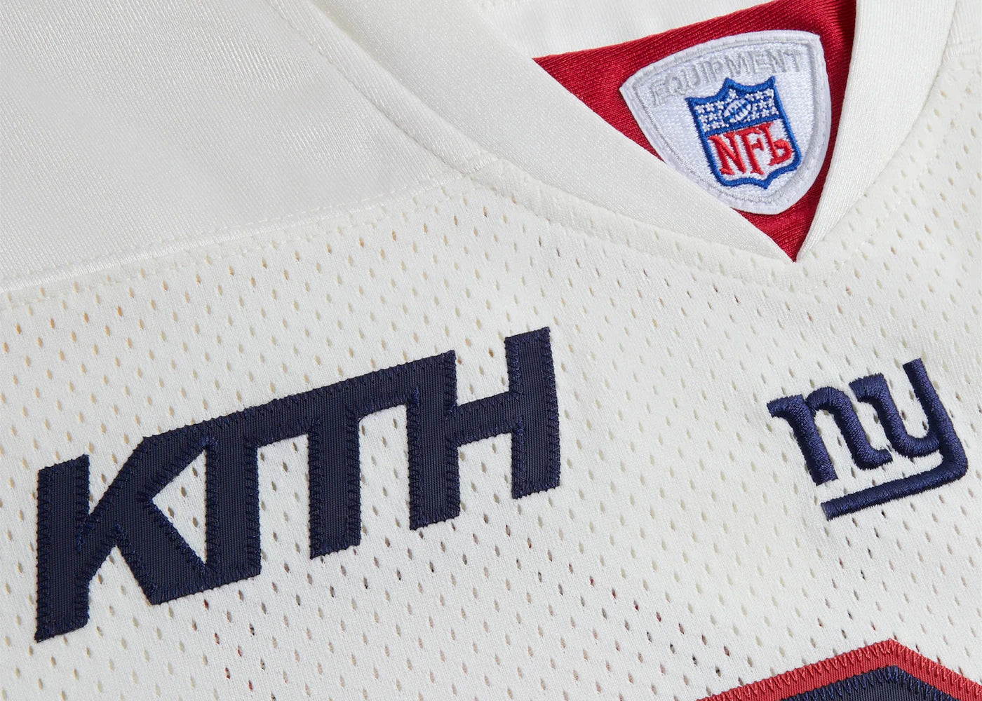The Kith x NFL Giants Mitchell & Ness Tiki Barber Jersey Sandrift is now available at Side Kicks!