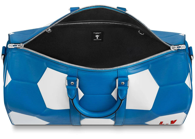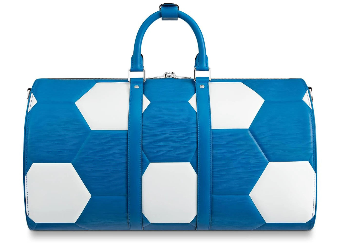 The Louis Vuitton x FIFA World Cup Keepall Bandouliere Hexagonal 50 Bleu is now available at Side Kicks!
