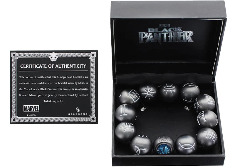 Wear your love of Marvel's blockbuster movie Black Panther with this Kimoyo Bead Bracelet! This version of the Kimoyo Bead Bracelet features a blue central bead. Elastic one size fit. Officially licensed bracelet comes packaged on Marvel branded card. A unique way to show off your Marvel fandom!