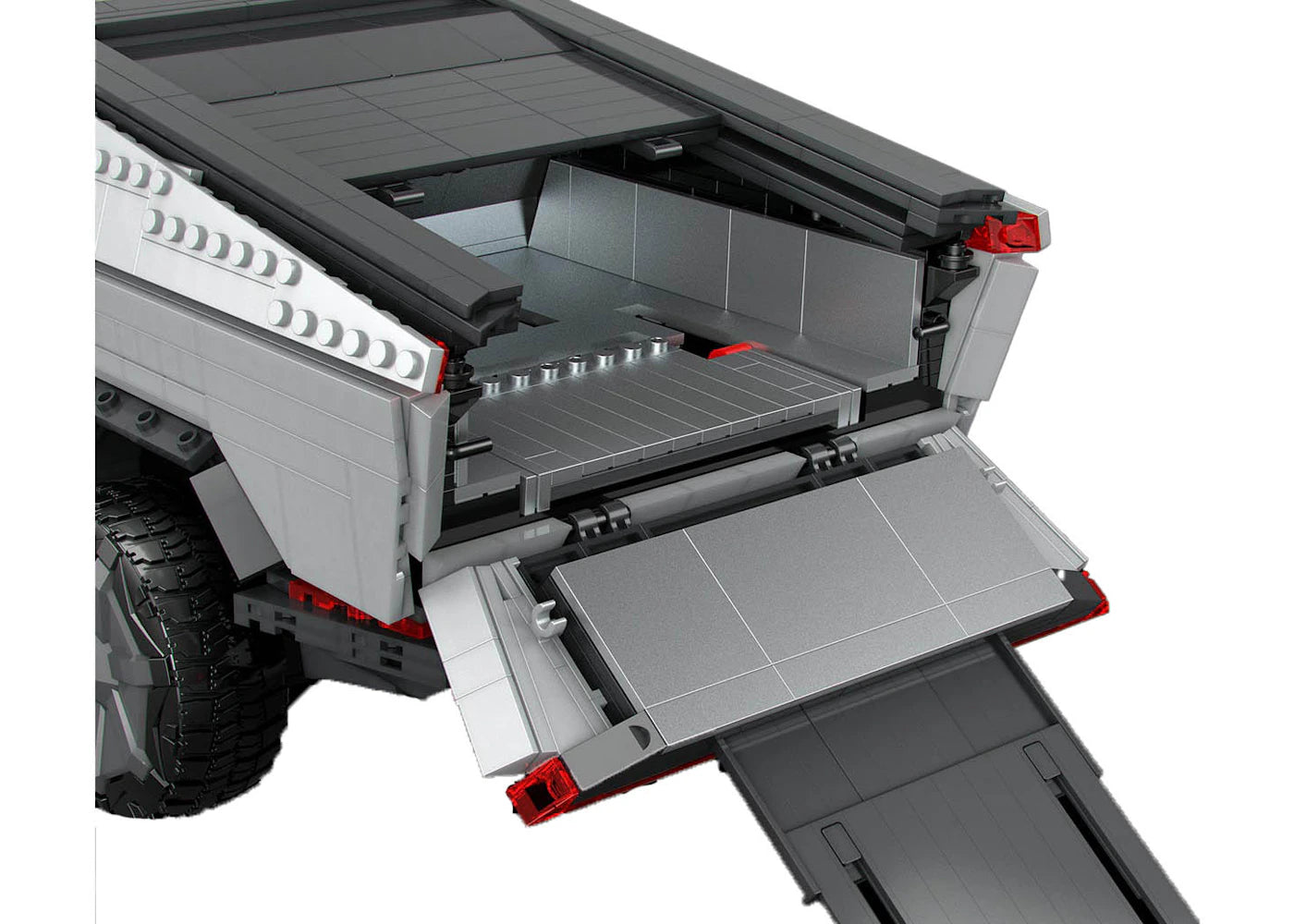 When fully constructed, the Cybertruck toy set by Mattel MEGA Construx x Tesla mimics the sharp lines, boxy silhouette, and exoskeleton-like exterior that make the Cybertruck stand out. It comes with cracks on the windows to create the illusion of bulletproofing and a folding tailgate. In addition, the doors open and close, the suspension is adjustable, and the seats fold. With 3,283 pieces, the set is intended for builders aged 14 and up, as well as collectors and art enthusiasts.