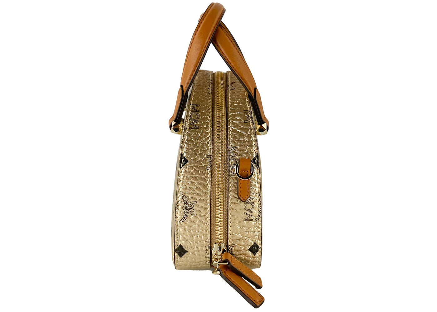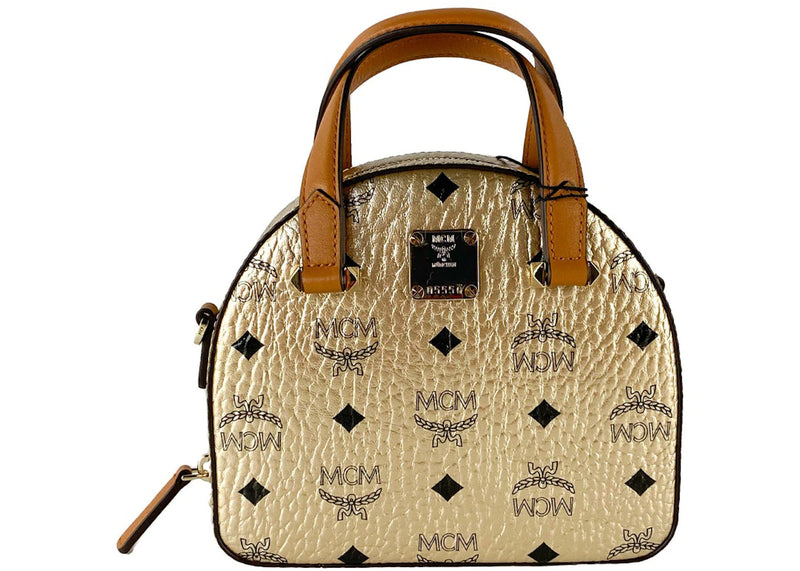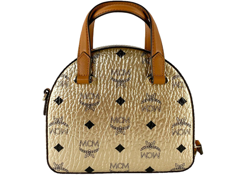 MCM Diamond Logo Visetos Mini Round Top Tote Bag Berlin Gold