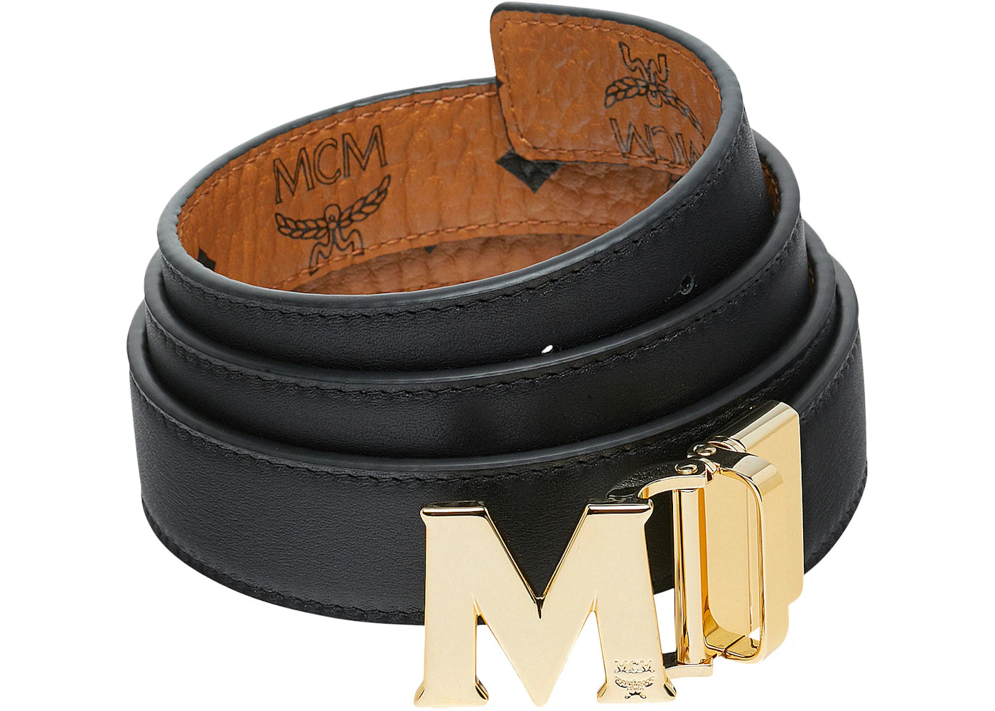 The MCM M Gold Buckle Reversible Belt Visetos 1.2" Cognac is now available at Side Kicks!