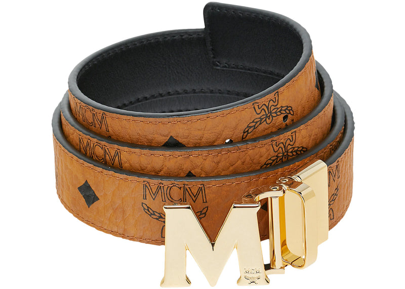 MCM M Gold Buckle Reversible Belt Visetos 1.2" Cognac