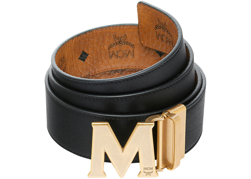 The MCM M Reversible Belt Visetos Antique Gold 1.75" Cognac is now available at Side Kicks!