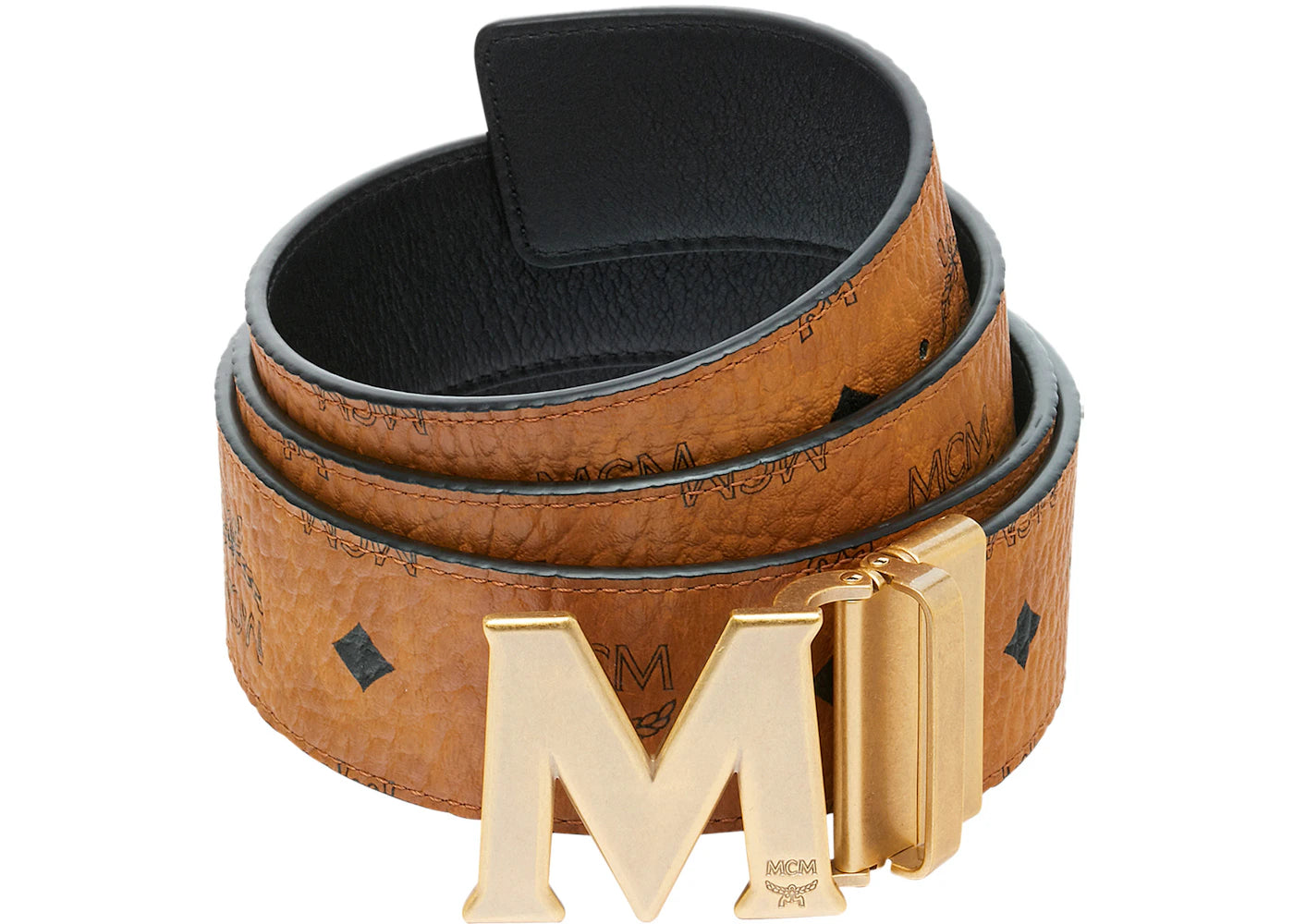 MCM M Reversible Belt Visetos Antique Gold 1.75" Cognac