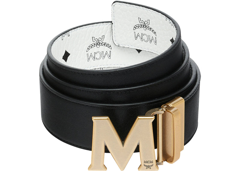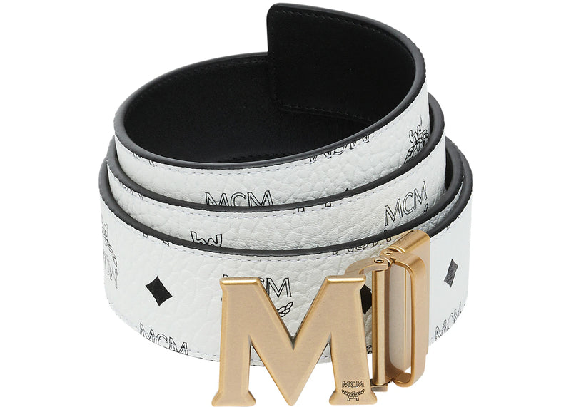 MCM M Reversible Belt Visetos Antique Gold 1.75" White