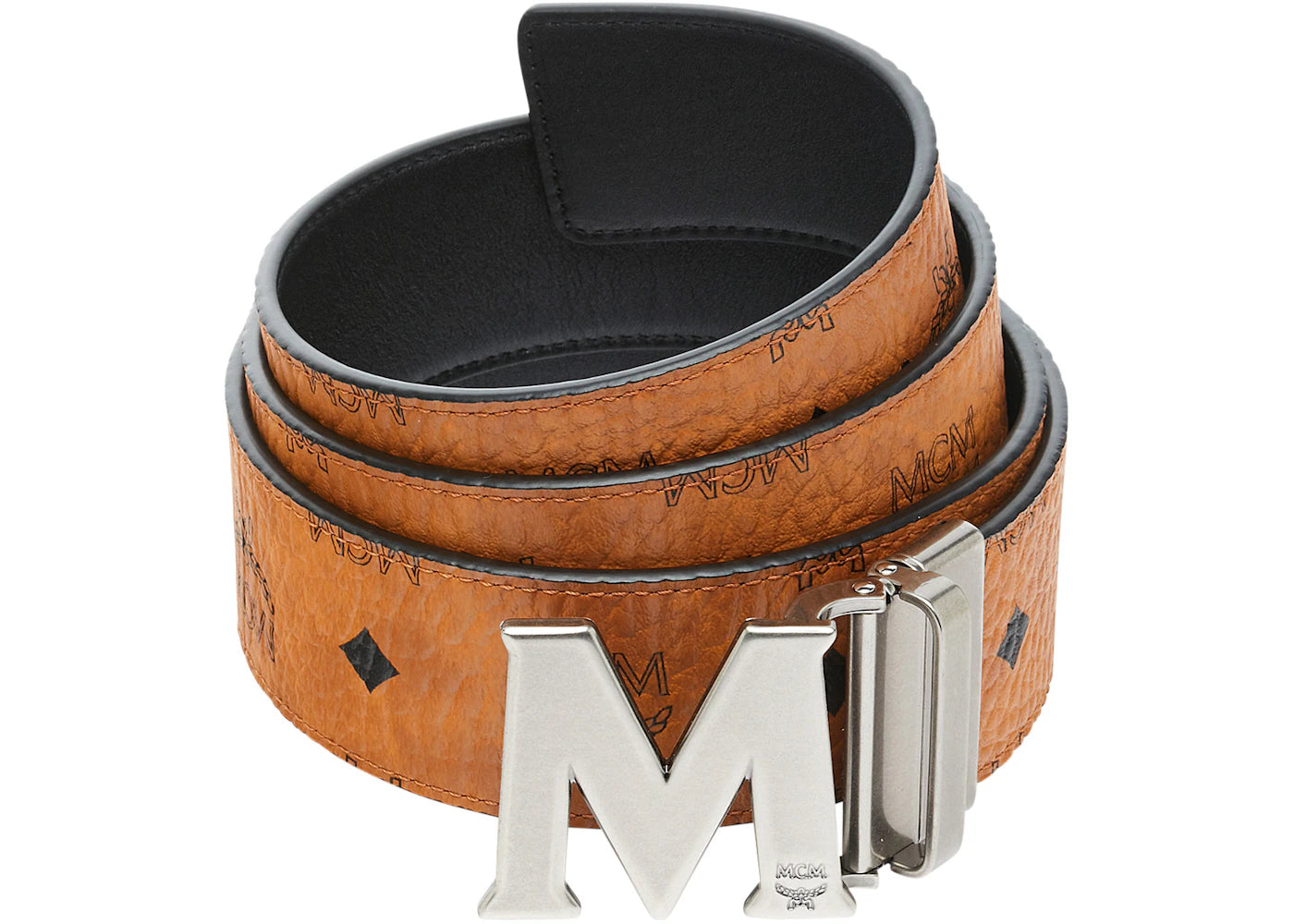 MCM M Reversible Belt Visetos Antique Silver 1.75" Cognac