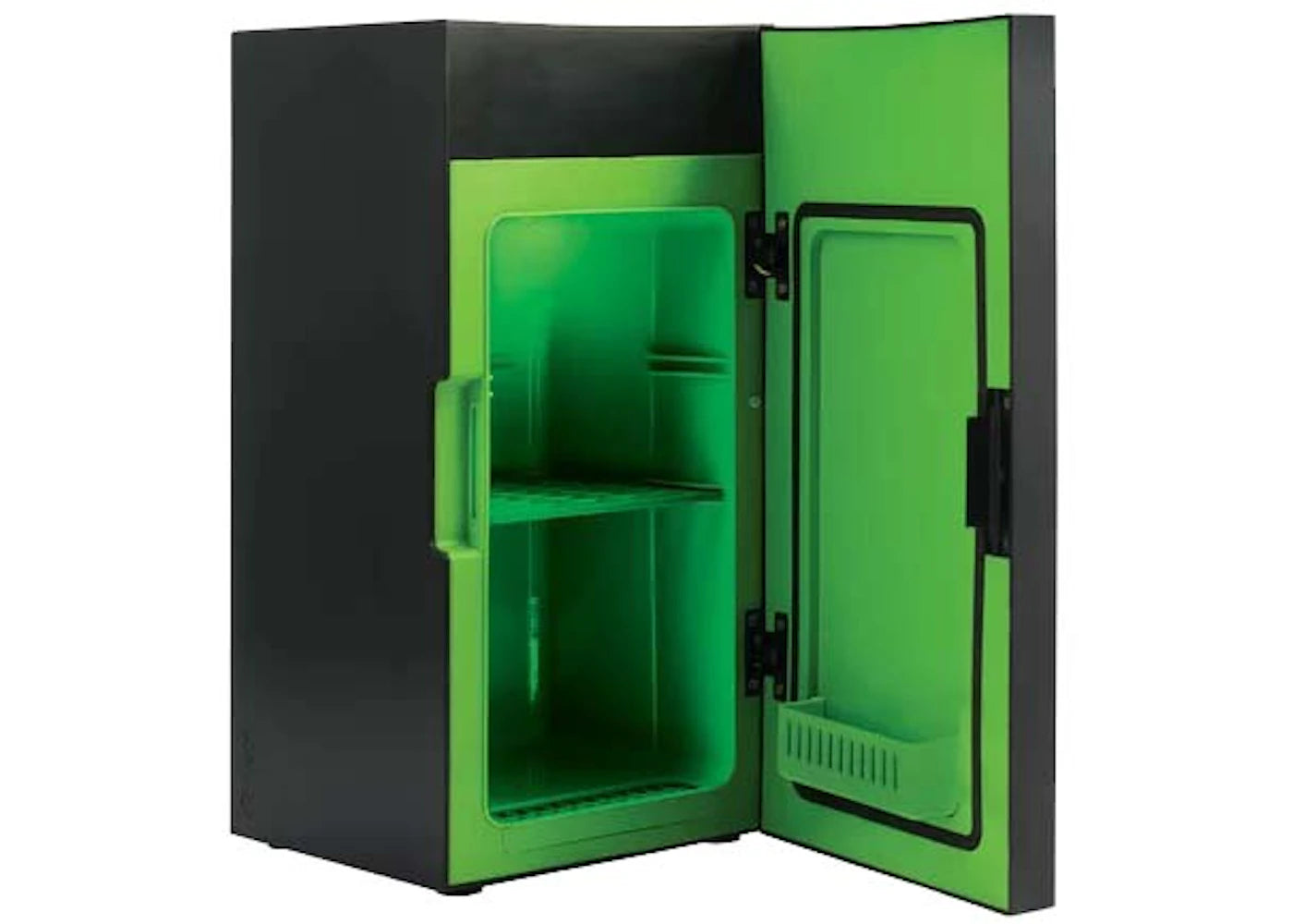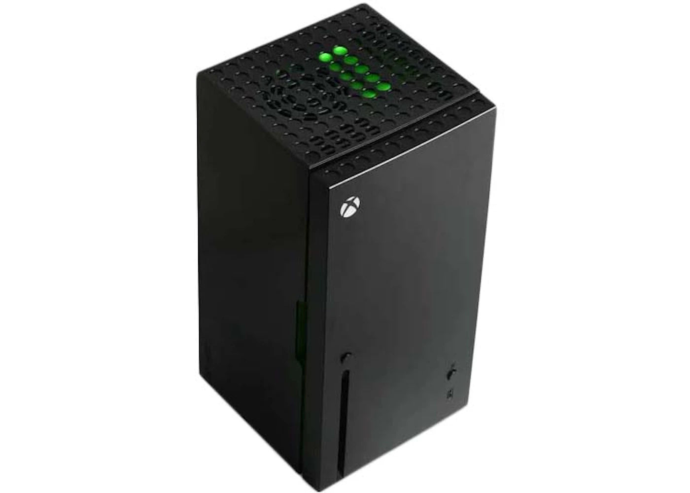 The Microsoft Xbox Series X Mini Fridge (US Plug) 1.2:1 Scale, 8 Can Capacity Version is a thermoelectric cooler that holds up to eight soda cans.
