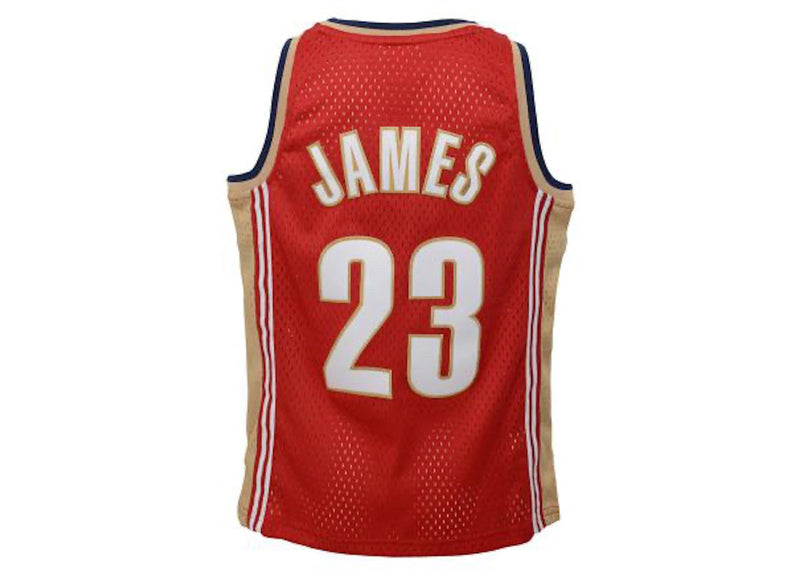 The Mitchell & Ness NBA Kids Cleveland Cavaliers James LeBron 2003-04 Swingman Road Jersey Red is now available at Side Kicks!