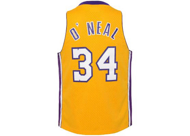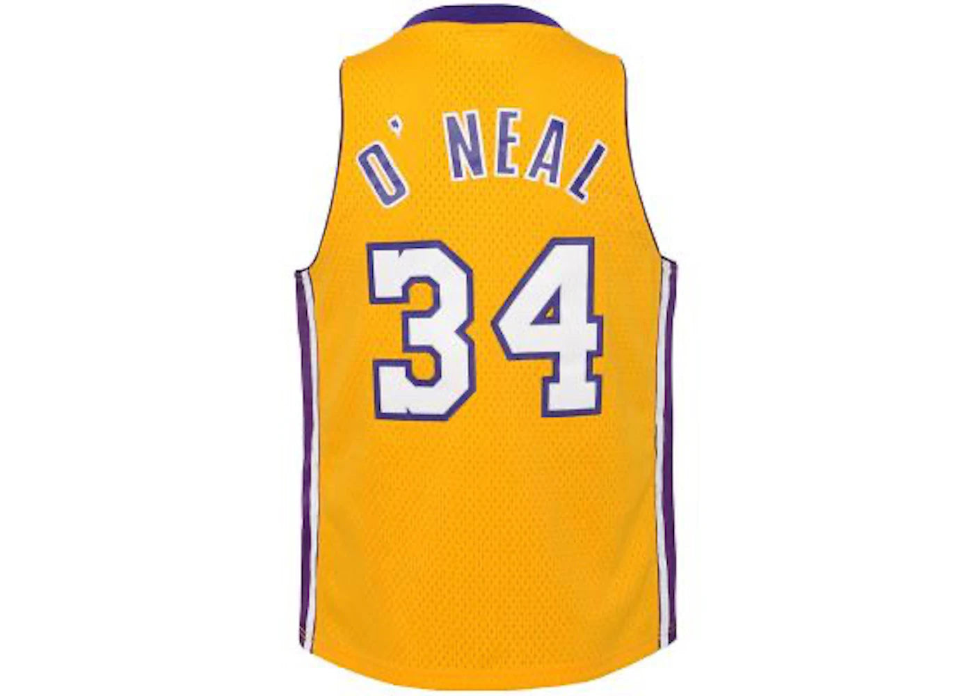 The Mitchell & Ness NBA Kids Los Angeles Lakers Shaquille O'Neal 1999-00 Swingman Home Jersey Light Gold is now available at Side Kicks!...