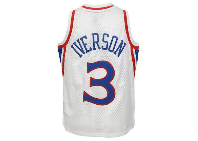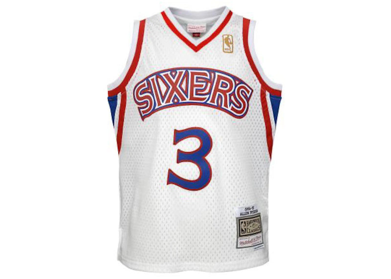 The Mitchell & Ness NBA Kids Philadelphia 76Ers Allen Iverson 1996-97 Swingman Home Jersey White is now available at Side Kicks!