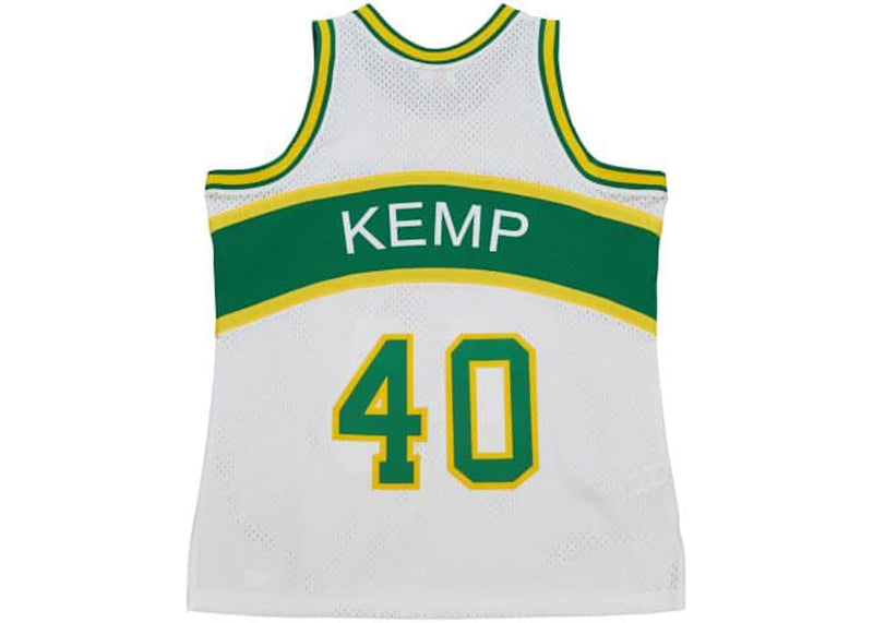 The Mitchell & Ness Shawn Kemp Seattle Supersonics Home 1994-95 NBA Jersey White/Green/Yellow is now available at Side Kicks!