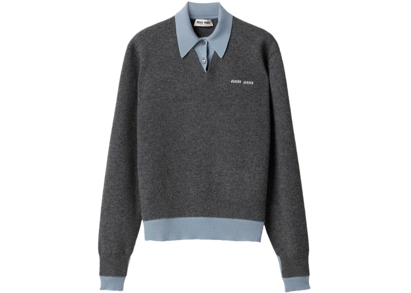 The Miu Miu Cashmere Wool Polo Gray/Blue Cashmere is now available at Side Kicks!