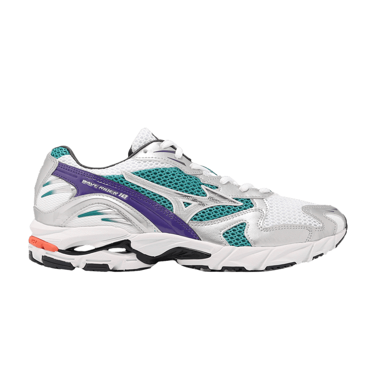 The Mizuno Wave Rider 10 White Silver Teal Purple is now available at Side Kicks!
