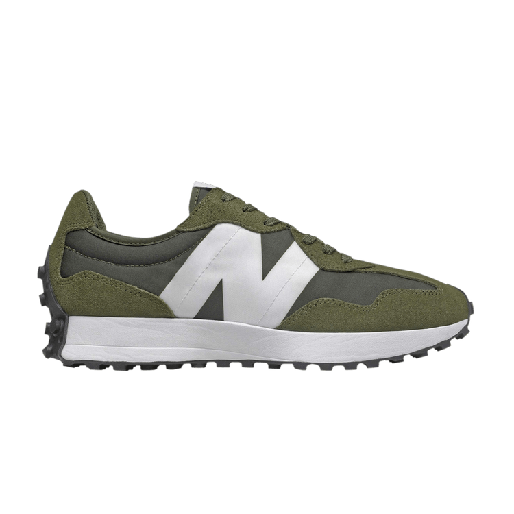 The New Balance 327 Olive has a canvas upper with suede overlays, tongue tabs, and laces in olive accents. The matte grey base features white detailing on the lateral N...