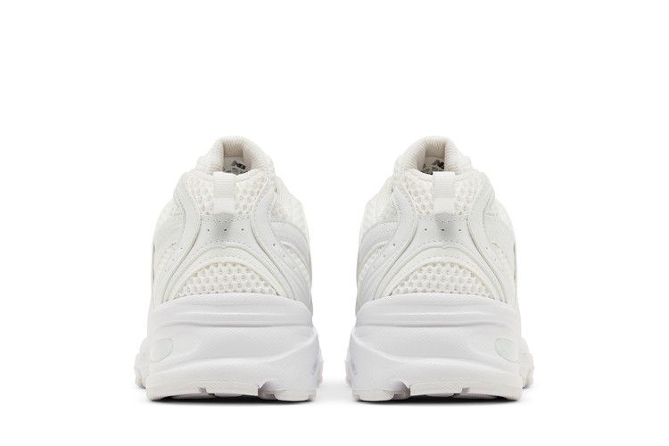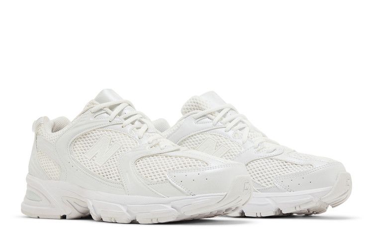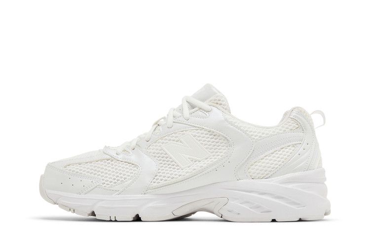 The New Balance 530 Triple White combines modern technology with early 2000s design cues. Its all-white construction features a breathable mesh upper with supportive overlays. Retro details include padded collar and tongue, segmented midsole pods, and a visible tech aesthetic. The responsive midsole Gel technology ensures energy return, while the lace-up closure and pull tabs enhance fit and wearability. The rubber outsole offers textured grip for traction on various surfaces. Released on November 28, 2023, the New Balance 530 Triple White is available now at Side Kicks.