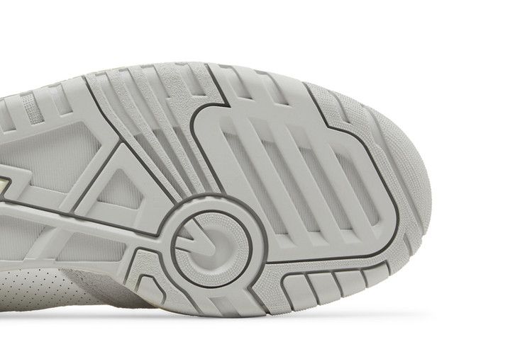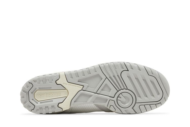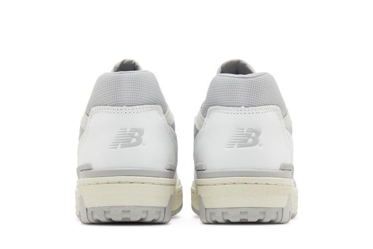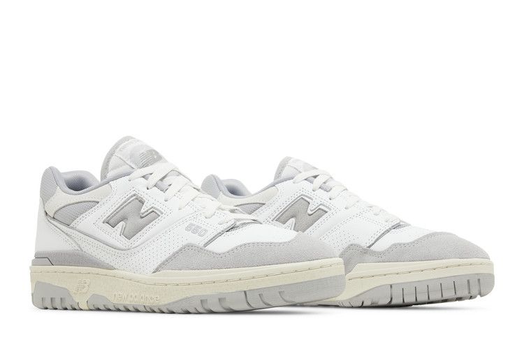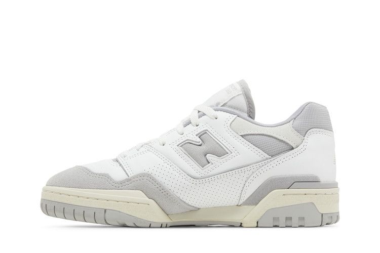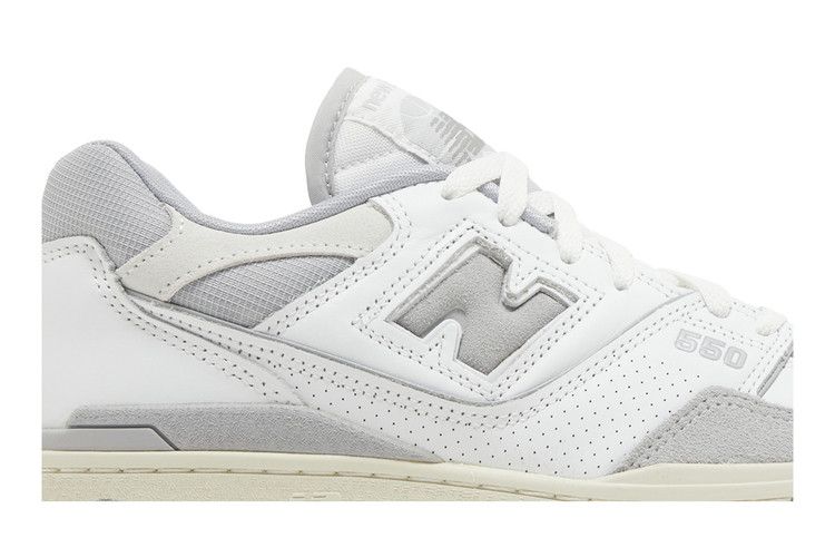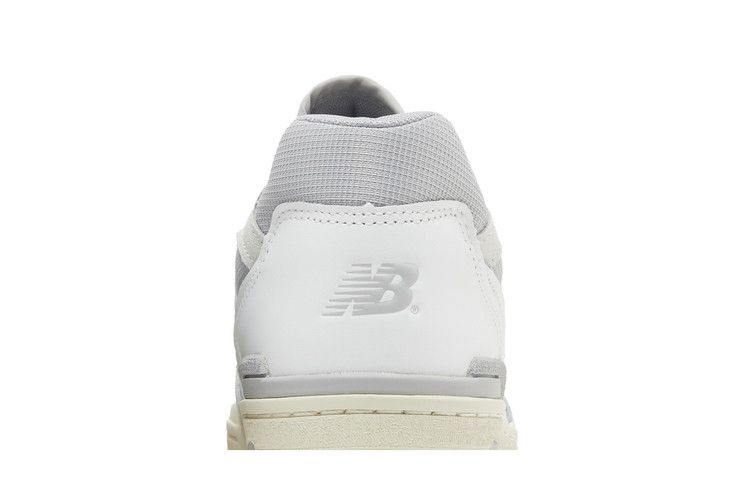 The New Balance 550 White Black Rain Cloud (GS) features a two-tone leather upper with grey and black overlays. A white "N" logo with black outline appears on the medial...