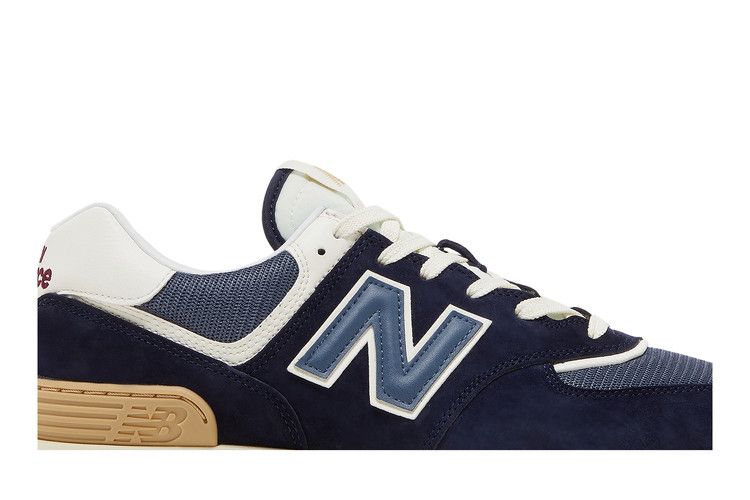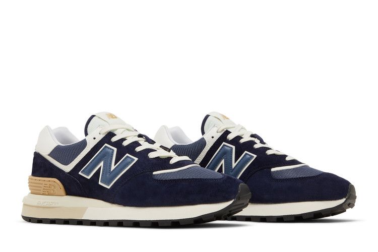 The New Balance 574 Navy White Beige features a dark gray textile upper with navy suede overlays and a beige heel support. White detailing outlines the signature "N" logo, while...