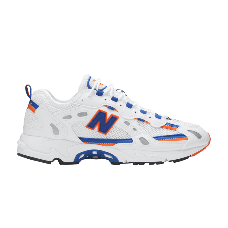 The New Balance 827 Abzorb OG Blue features a white mesh upper with leather overlays and orange and blue accents on the 'N' logo, heel pull tab, and synthetic webbing...