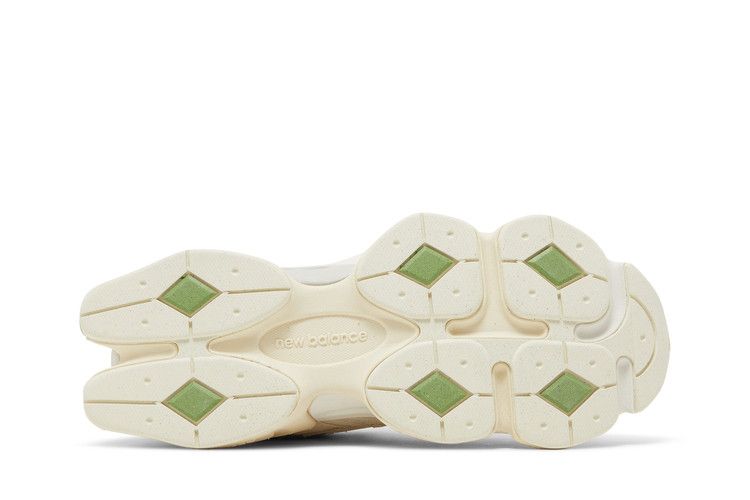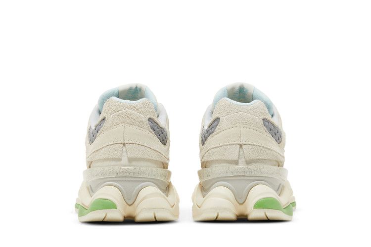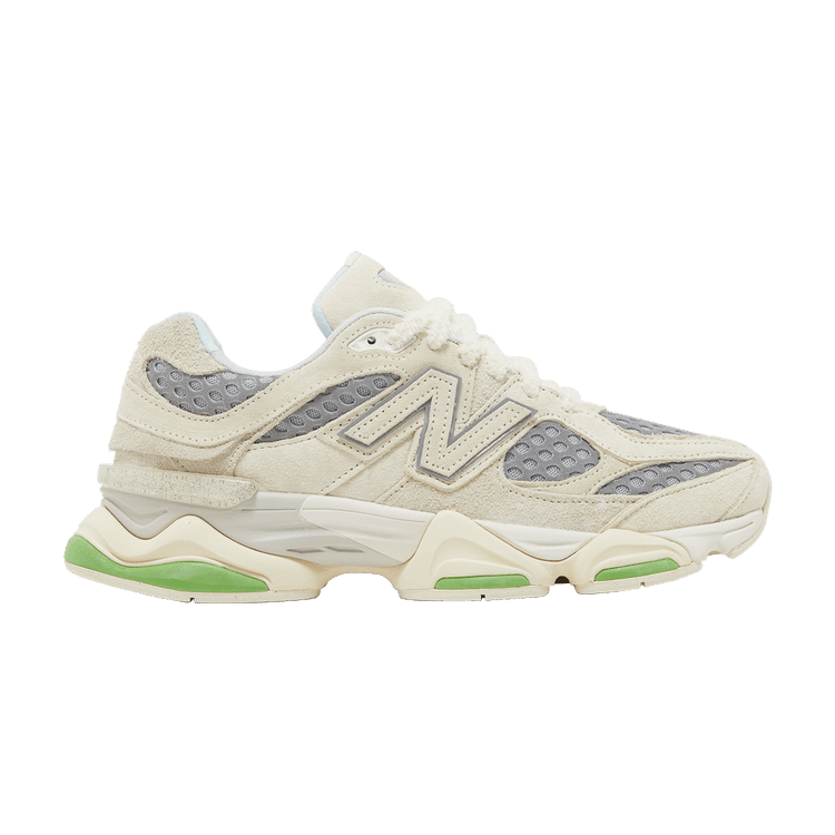 The New Balance 9060 Bricks & Wood features a beige, grey, and green colorway. Its mesh upper provides breathability, while the rubber outsole ensures grip and stability. The cushioned midsole offers support, and the padded tongue and collar enhance comfort. A secure fit is achieved through the lacing system, and the lateral sides display the signature "N" emblem.