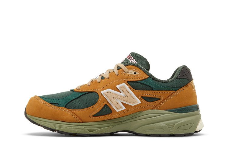 The New Balance 990v3MiUSA Tan Green features a premium leather and mesh upper with foam cushioning in the midsole. The rubber outsole provides traction, while the heel counter enhances stability....