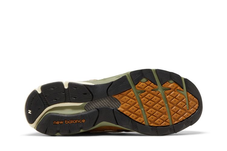 Its tan and forest green colorway includes branding on the heel, sidewall, and tongue. The design includes a toe cap and a multi-toned sole, with the 990 collection symbol on the rear panel.