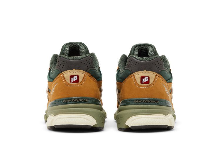The New Balance 990v3MiUSA Tan Green features a premium leather and mesh upper with foam cushioning in the midsole. The rubber outsole provides traction, while the heel counter enhances stability.