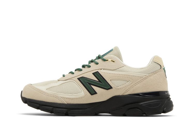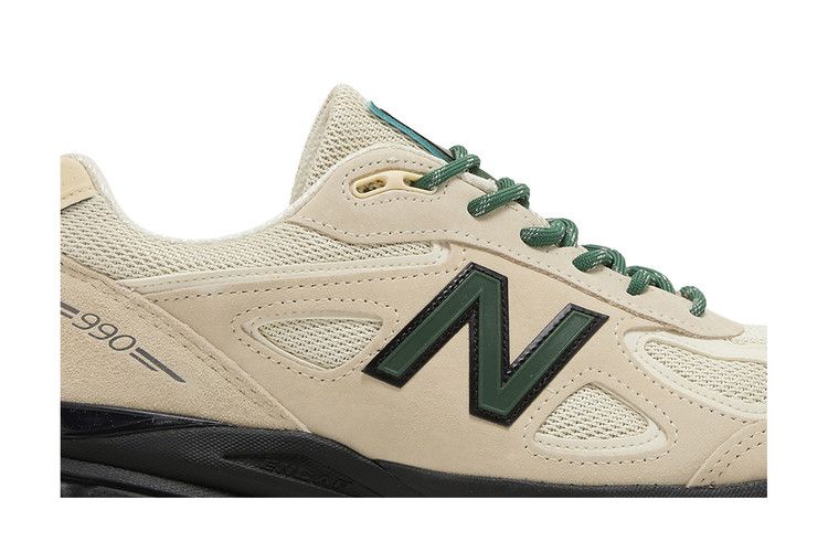 The New Balance 990v4 MiUSA Teddy Santis Macadamia Nut features a cream mesh upper with smooth leather overlays in Macadamia Nut. Black stitching secures each panel, while lighter cream accents and dark green N logos add contrast. Green laces and a MiUSA tongue patch complete the design, along with 990 branding on the heel. The black midsole and outsole provide durability.