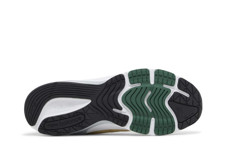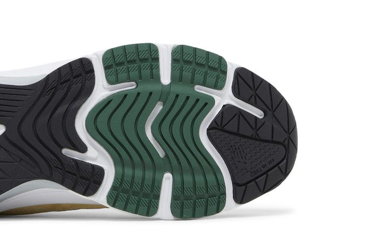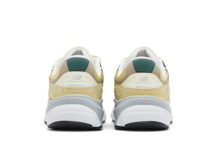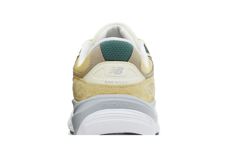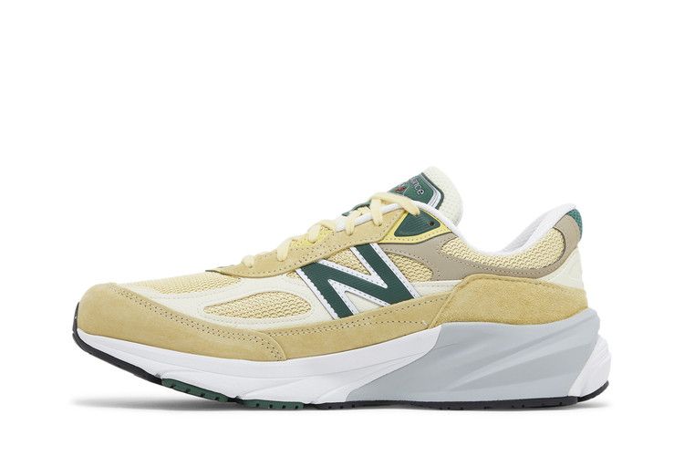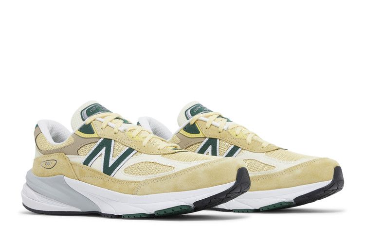 The New Balance 990v6 MiUSA Sulphur Green features a golden mesh upper with cream leather, cocoa-brown overlays, and dark golden suede accents. A butter-yellow lace closure ensures a secure fit....