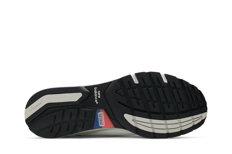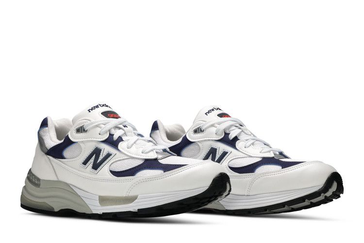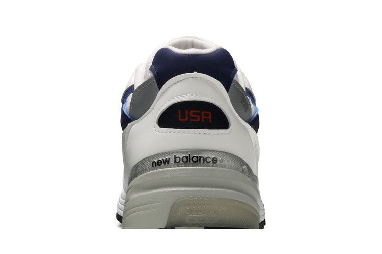 The New Balance 992 MiUSA Blue Silver Metallic features a mesh and suede upper in blue and green tones. It includes white laces, grey heel tabs, and grey inner liners...